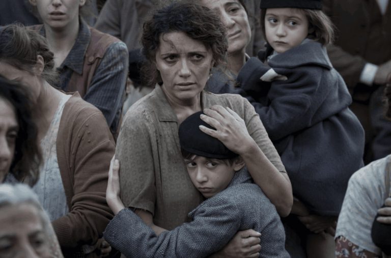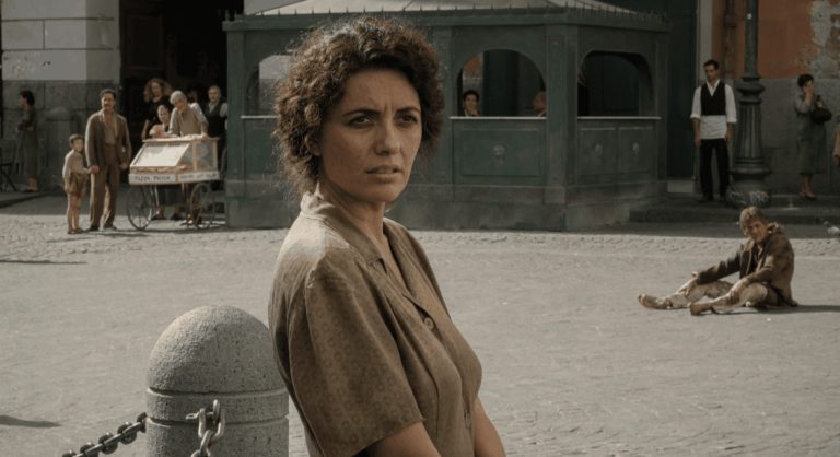 Um letreiro avisa que estamos agora em Nápoles, 1944. Amerigo tem seis anos de idade – interpretado por um fantástico garoto chamado Christian Cervone (na foto abaixo). Há um bombardeio no bairro pobre de Nápoles em que ele mora com a mãe, Antonietta Speranza (o papel de Serena Rossi, na foto abaixo). Dezenas de moradores estão naquele momento fugindo dali, das bombas que estão chegando cada vez mais perto. Antonietta, desesperada, berra o nome do filho – que, sem perceber o perigo, literalmente brincando com fogo, está escondido ali pertinho, olhando a mãe que berra por ele, parecendo se divertir com aquilo.