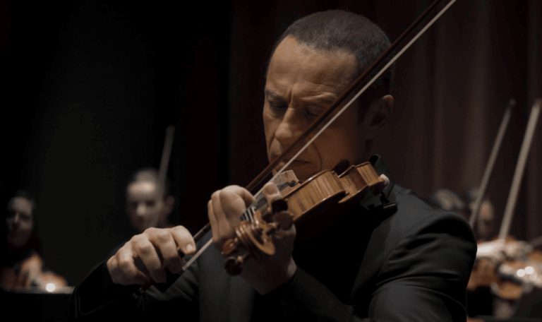 Em seguida vemos o maestro entrar no palco, toda a orquestra e o teatro lotado já prontos para recebê-lo. Amerigo começa a tocar o violino – e começamos a ver na tela as imagens que certamente estão passando na cabeça dele naquele momento.