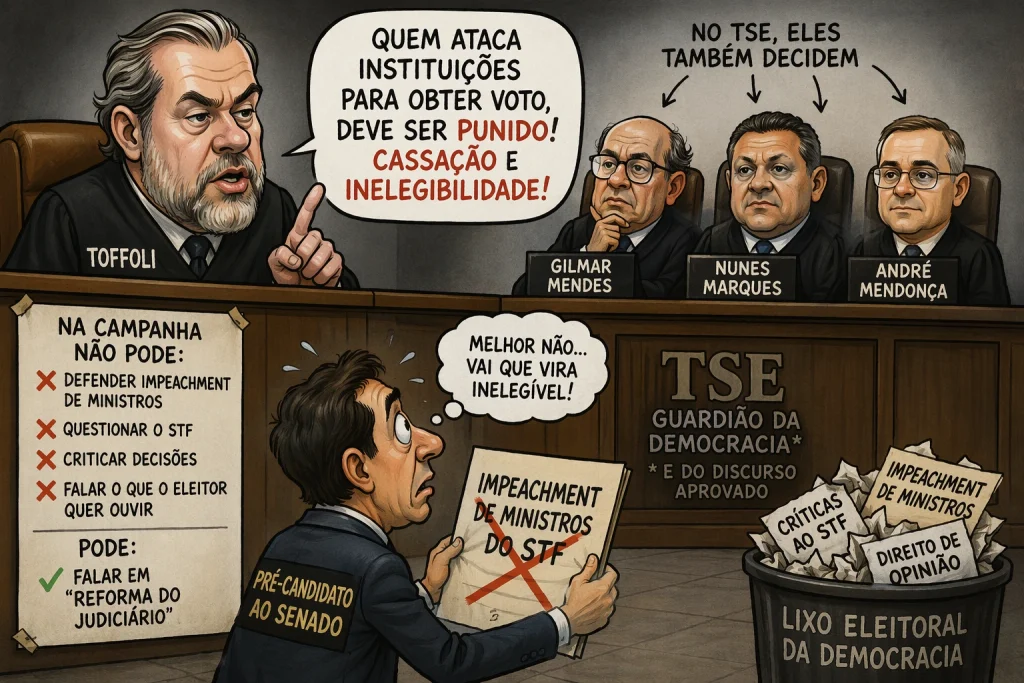 A recente “sugestão” de Toffoli dizendo que defender o impeachment de ministros do Supremo pode custar o mandato de um candidato é o estágio final da metástase institucional: o direito constitucional que virou crime eleitoral por analogia. A declaração de Dias Toffoli não caiu como uma bomba — caiu como um aviso, uma ameaça. Um daqueles “avisos” que não precisam ser formalizados para produzir efeito.