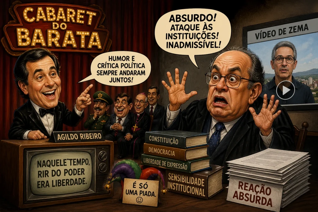 A resposta de Gilmar Mendes ao vídeo produzido por Romeu Zema parece saída de um roteiro que nem os roteiristas mais criativos do antigo Cabaré do Barata,(o link mostra o programa) de 1989, ousariam assinar sem medo de parecer exagerados. Se Agildo Ribeiro ainda estivesse entre nós, certamente encontraria nesse embate o roteiro perfeito para uma de suas esquetes ácidas, onde a pompa da toga e o pragmatismo mineiro se chocam de forma tão desproporcional que o resultado só pode ser a gargalha ou o espanto.